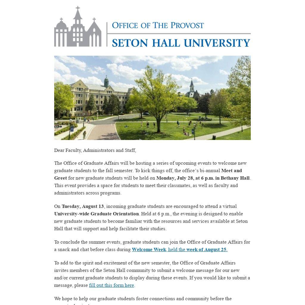 To add to the spirit and excitement of the new semester, the Office of Graduate Affairs invites members of the Seton Hall community to submit a welcome message for our new and/or current graduate students to display during these events. If you would like to submit a message, please fill out this form here.