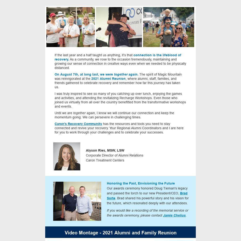 Caron's Recovery Community has the resources and tools you need to stay connected and revive your recovery. Your Regional Alumni Coordinators and I are here for you to work through your challenges and to celebrate your successes.