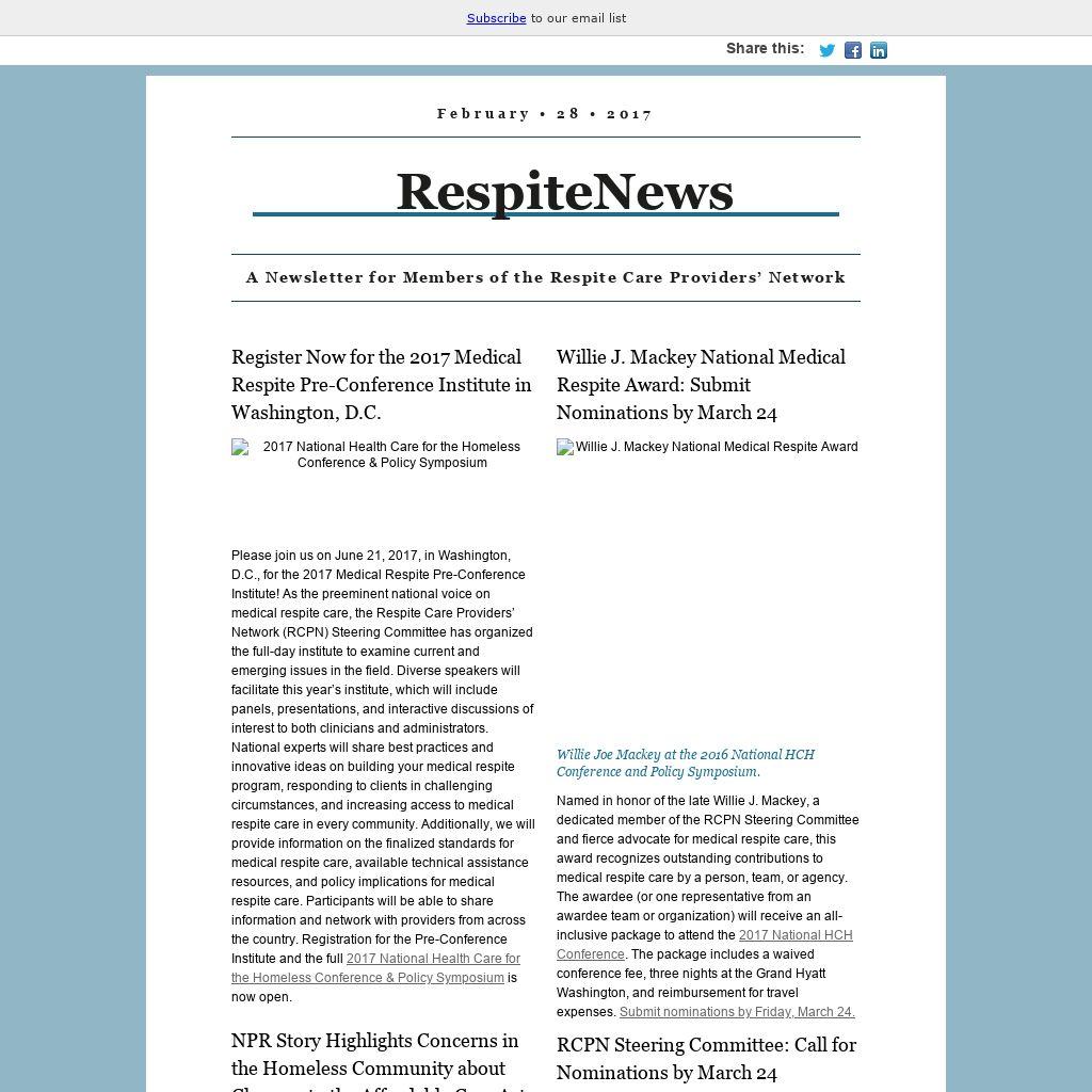 Please join us on June 21, 2017, in Washington, D.C., for the 2017 Medical Respite Pre-Conference Institute! As the preeminent national voice on medical respite care, the Respite Care Providers’ Network (RCPN) Steering Committee has organized the full-day institute to examine current and emerging issues in the field. Diverse speakers will facilitate this year’s institute, which will include panels, presentations, and interactive discussions of interest to both clinicians and administrators. National experts will share best practices and innovative ideas on building your medical respite program, responding to clients in challenging circumstances, and increasing access to medical respite care in every community. Additionally, we will provide information on the finalized standards for medical respite care, available technical assistance resources, and policy implications for medical respite care. Participants will be able to share information and network with providers from across the country. Registration for the Pre-Conference Institute and the full 2017 National Health Care for the Homeless Conference & Policy Symposium is now open.
