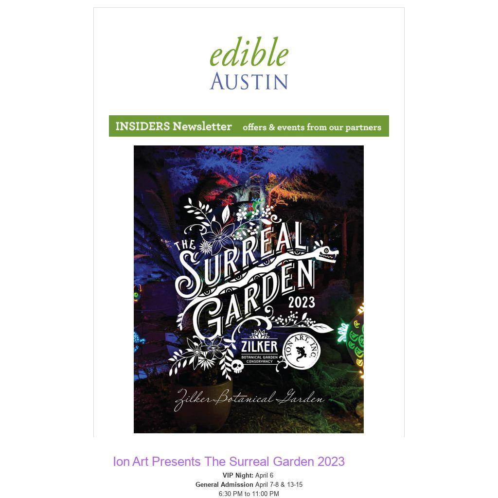 Edible Austin is giving away 2 tickets for the exclusive opening night VIP event on April 6th, illuminating the beauty of the Garden at night with the unveiling of some incredible neon art never seen before! SUBMIT YOUR ENTRY BY MONDAY, MARCH 27 at NOON.Â