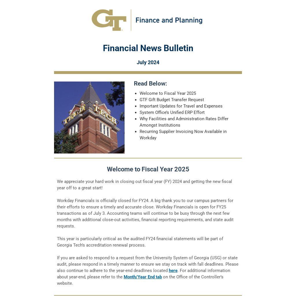 Workday Financials is officially closed for FY24. A big thank you to our campus partners for their efforts to ensure a timely and accurate close. Workday Financials is open for FY25 transactions as of July 3. Accounting teams will continue to be busy through the next few months with additional close-out activities, financial reporting requirements, and state audit requests.