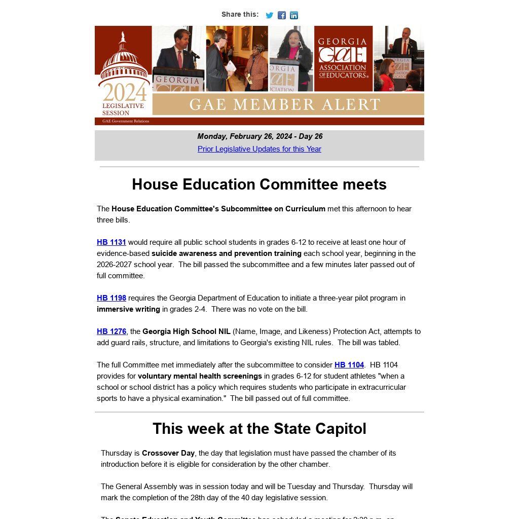Next Legislative Update will be Tuesday, February 27 - Day 27