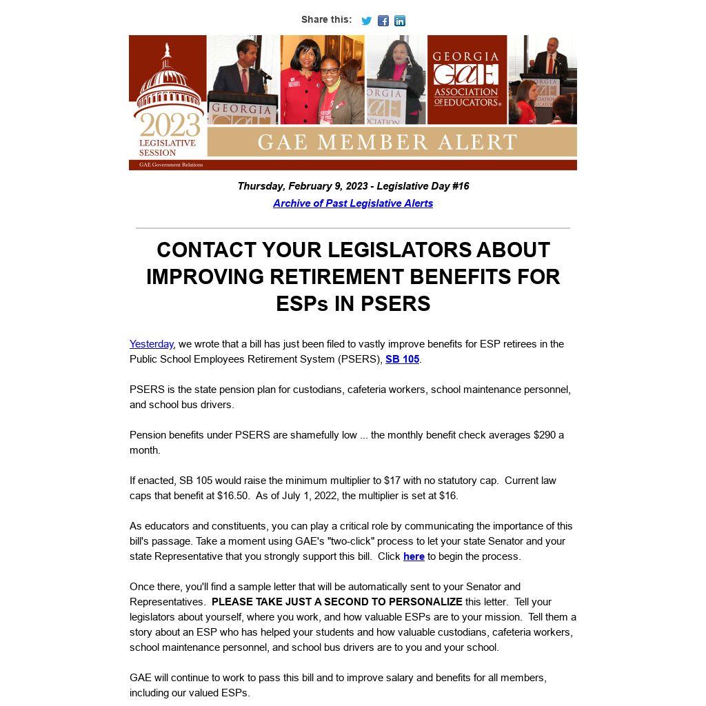 CONTACT YOUR LEGISLATORS ABOUT IMPROVING RETIREMENT BENEFITS FOR ESPs IN PSERS
