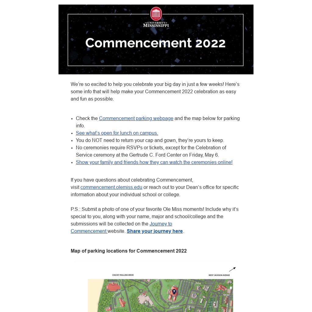If you have questions about celebrating Commencement, visitcommencement.olemiss.eduor reach out to your Dean’s office for specific information about your individual school or college.
