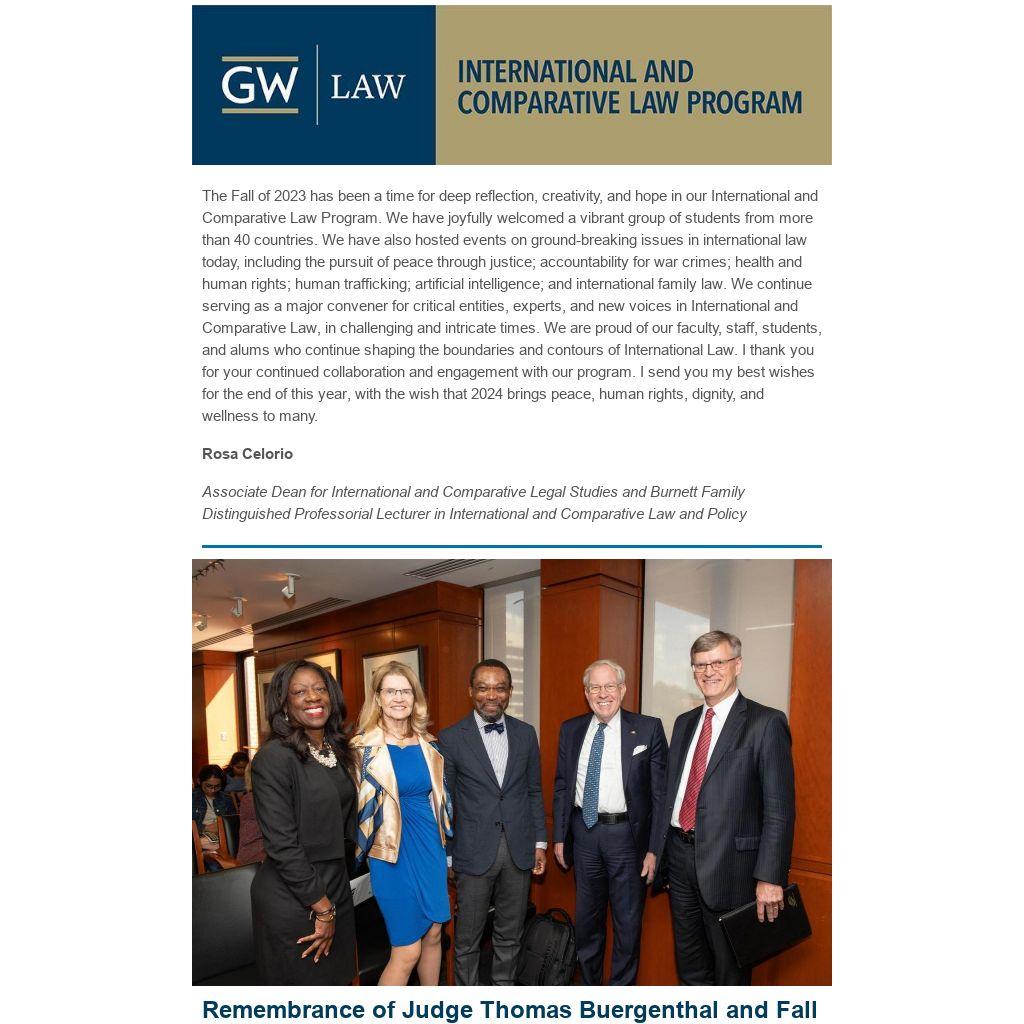 The Fall of 2023 has been a time for deep reflection, creativity, and hope in our International and Comparative Law Program. We have joyfully welcomed a vibrant group of students from more than 40 countries. We have also hosted events on ground-breaking issues in international law today, including the pursuit of peace through justice; accountability for war crimes; health and human rights; human trafficking; artificial intelligence; and international family law. We continue serving as a major convener for critical entities, experts, and new voices in International and Comparative Law, in challenging and intricate times. We are proud of our faculty, staff, students, and alums who continue shaping the boundaries and contours of International Law. I thank you for your continued collaboration and engagement with our program. I send you my best wishes for the end of this year, with the wish that 2024 brings peace, human rights, dignity, and wellness to many.