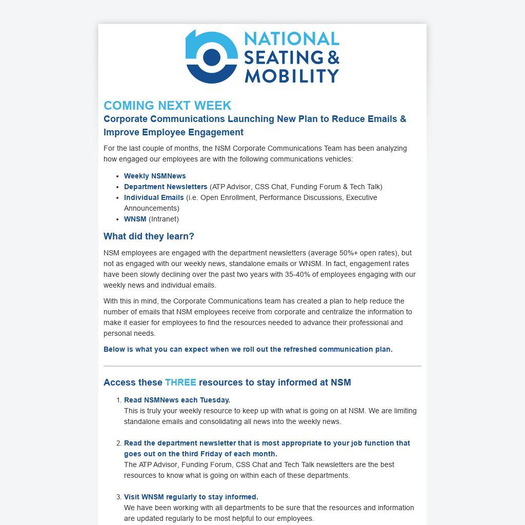 For the last couple of months, the NSM Corporate Communications Team has been analyzing how engaged our employees are with the following communications vehicles: