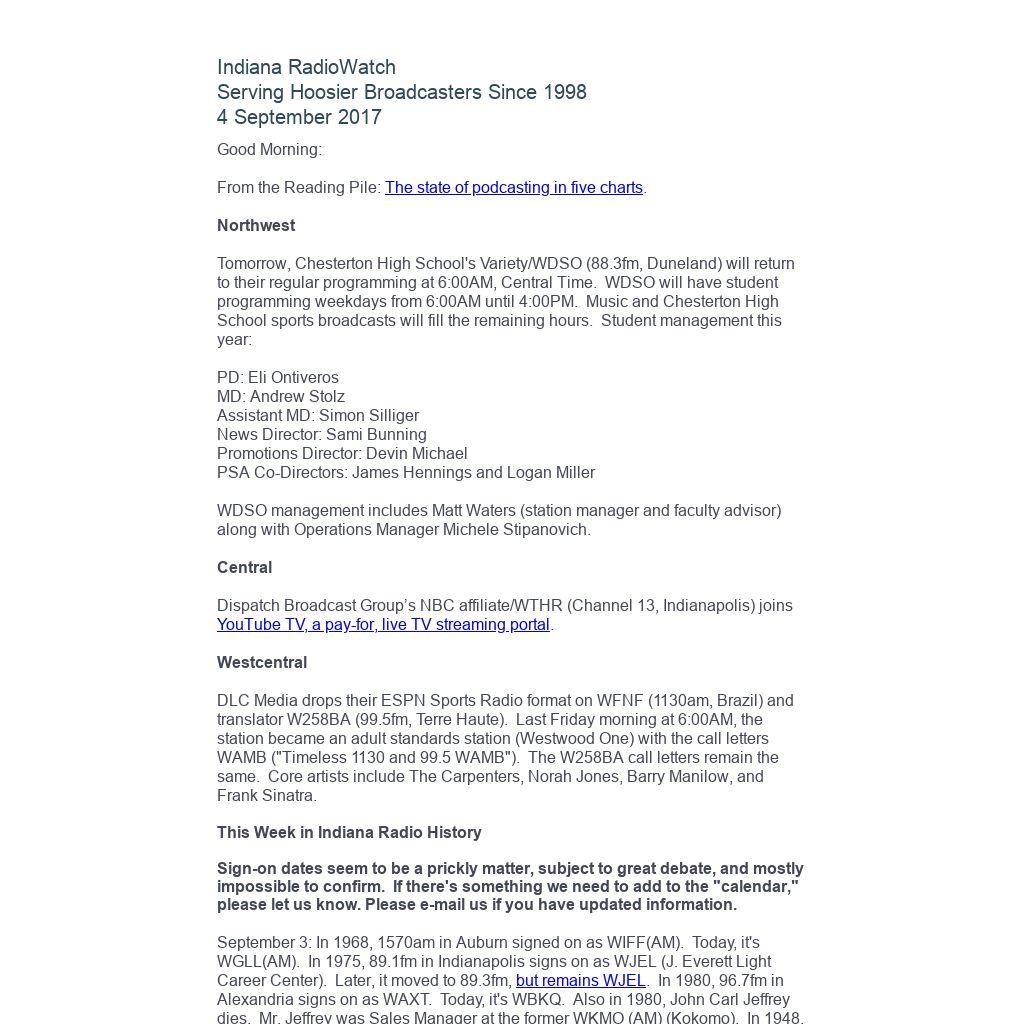 Indiana RadioWatch subscriptions are free. To subscribe, send an e-mail to irw@well.com and we'll add you. After publication, we archive Indiana RadioWatch on the Indiana Radio Archive at http://www.indianaradio.net. Please e-mail us your news stories and employment opportunities.