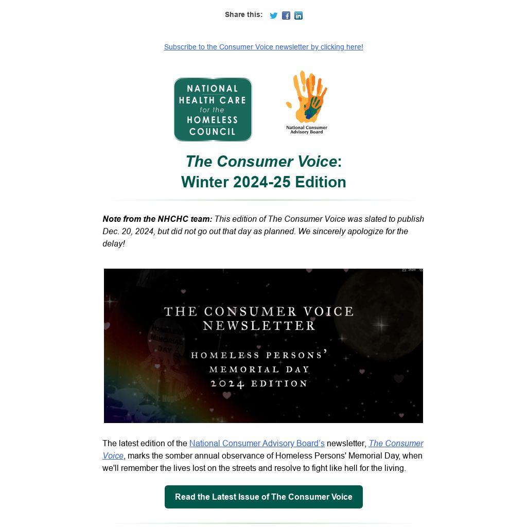 The latest edition of the National Consumer Advisory Board’s newsletter, The Consumer Voice, marks the somber annual observance of Homeless Persons' Memorial Day, when we'll remember the lives lost on the streets and resolve to fight like hell for the living.