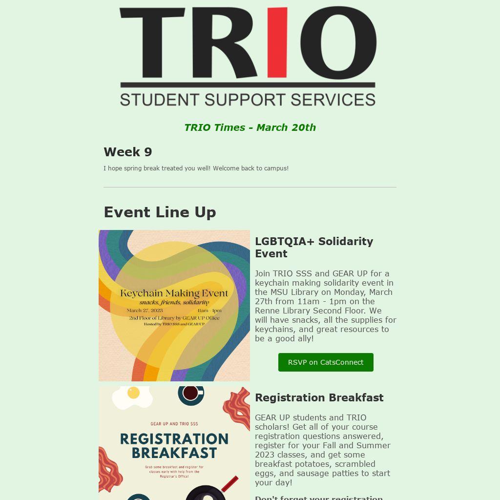 Join TRIO SSS and GEAR UP for a keychain making solidarity event in the MSU Library on Monday, March 27th from 11am - 1pm on the Renne Library Second Floor. We will have snacks, all the supplies for keychains, and great resources to be a good ally!