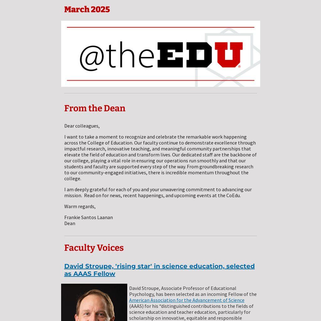 I want to take a moment to recognize and celebrate the remarkable work happening across the College of Education. Our faculty continue to demonstrate excellence through impactful research, innovative teaching, and meaningful community partnerships that elevate the field of education and transform lives. Our dedicated staff are the backbone of our college, playing a vital role in ensuring our operations run smoothly and that our students and faculty are supported every step of the way. From groundbreaking research to our community-engaged initiatives, there is incredible momentum throughout the college.