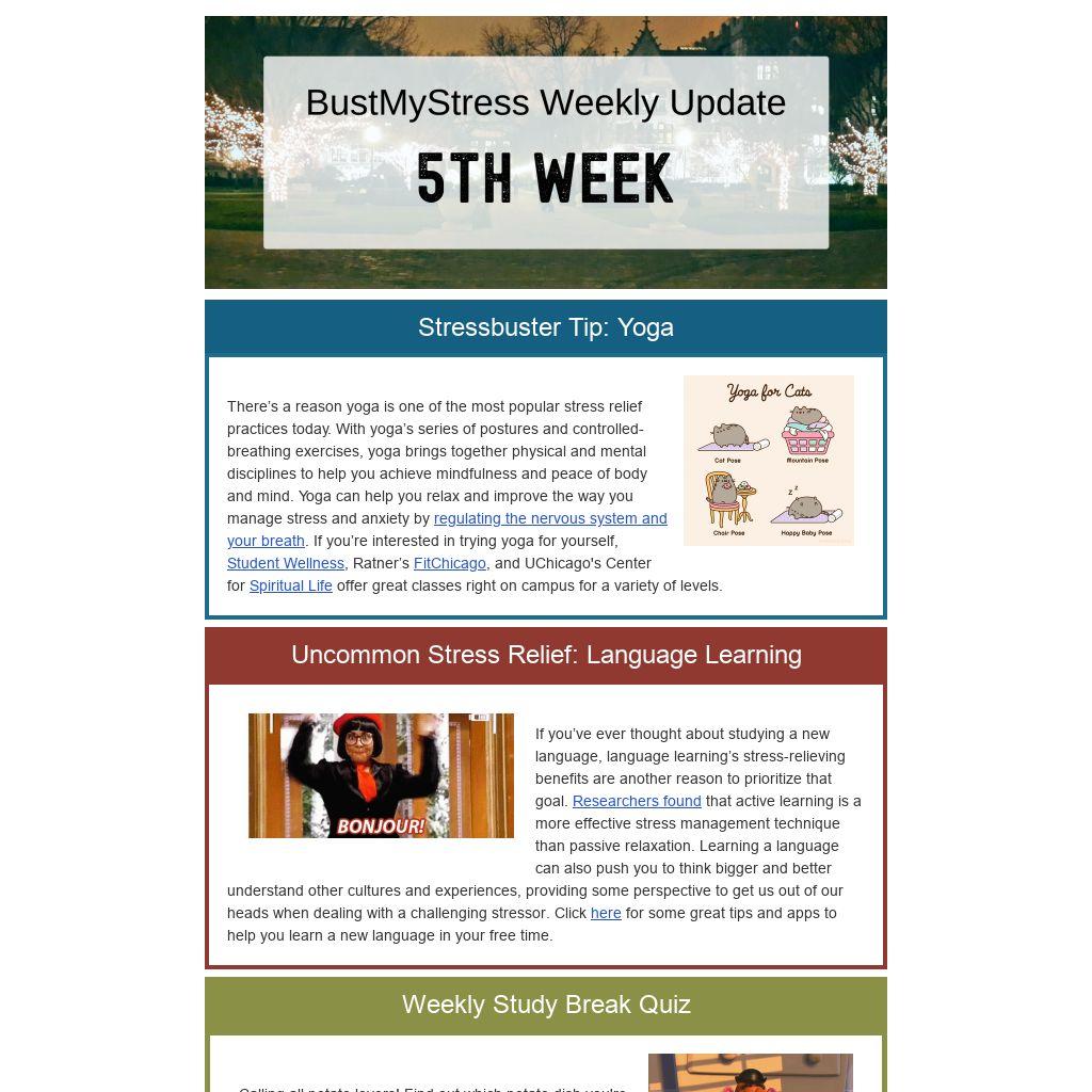 There’s a reason yoga is one of the most popular stress relief practices today. With yoga’s series of postures and controlled-breathing exercises, yoga brings together physical and mental disciplines to help you achieve mindfulness and peace of body and mind. Yoga can help you relax and improve the way you manage stress and anxiety by regulating the nervous system and your breath. If you’re interested in trying yoga for yourself, Student Wellness, Ratner’s FitChicago, and UChicago's Center for Spiritual Life offer great classes right on campus for a variety of levels.