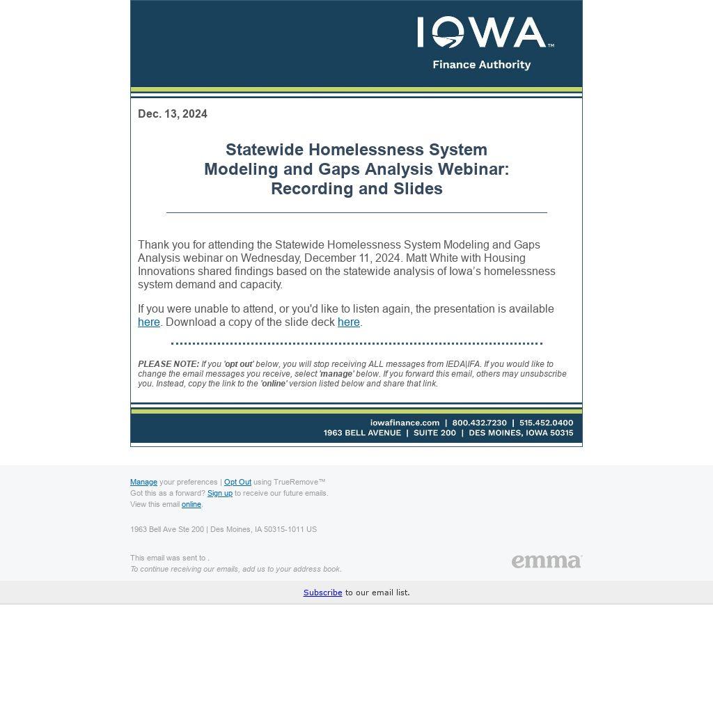 Thank you for attending the Statewide Homelessness System Modeling and Gaps Analysis webinar on Wednesday, December 11, 2024. Matt White with Housing Innovations shared findings based on the statewide analysis of Iowa’s homelessness system demand and capacity.