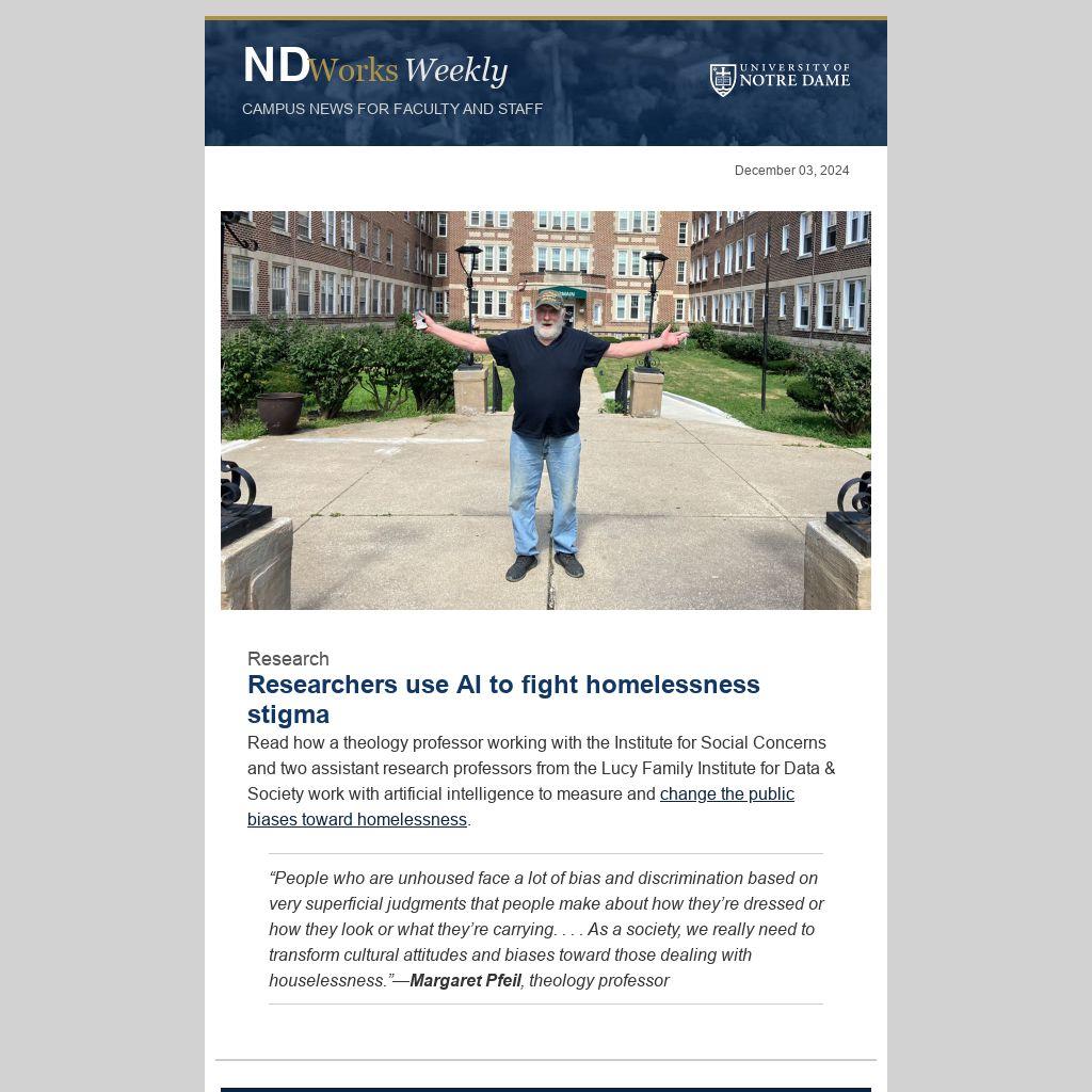 Read how a theology professor working with the Institute for Social Concerns and two assistant research professors from the Lucy Family Institute for Data & Society work with artificial intelligence to measure and change the public biases toward homelessness.