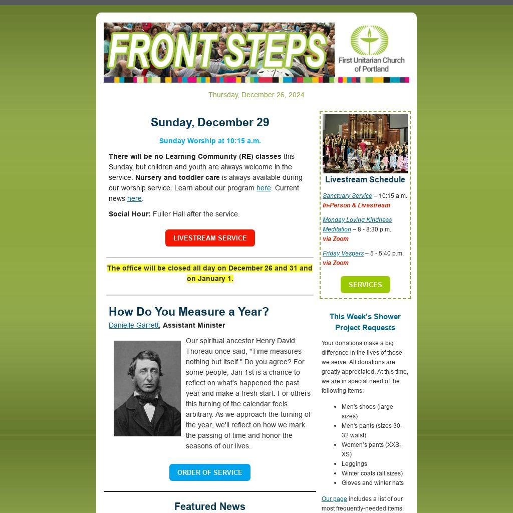 Join Danielle Garrett, Jen Thomas, and church member Bill after the service in Channing Room A-101 to learn more about First Unitarian Portland and our programs, and to meet some leaders in the church and take a tour. This is also an opportunity to ask about membership for those interested in making a deeper commitment to First U.