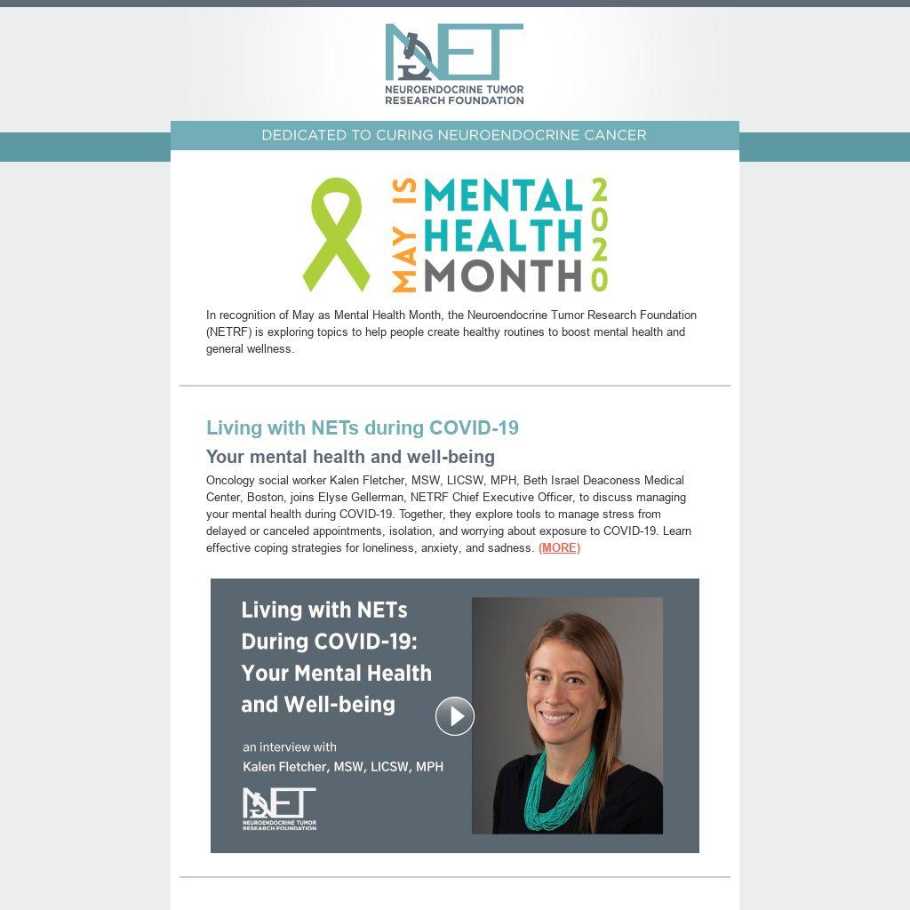 In recognition of May as Mental Health Month, the Neuroendocrine Tumor Research Foundation (NETRF) is exploring topics to help people create healthy routines to boost mental health and general wellness.