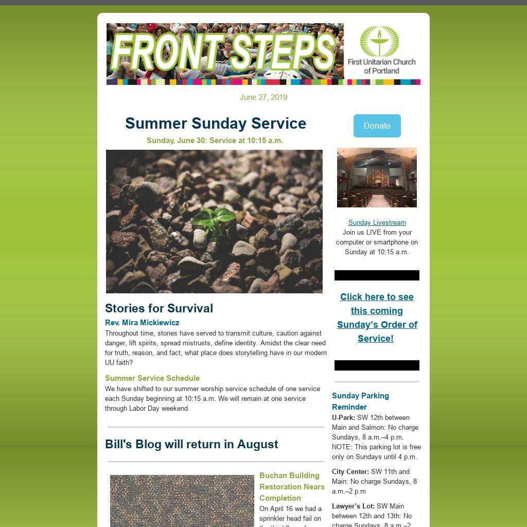 Do You Have an Item for E-news and/or the Sunday Bulletin?If you have an item you’d like published in our weekly Front Steps (eNews) or the Sunday Bulletin, please submit it to:
