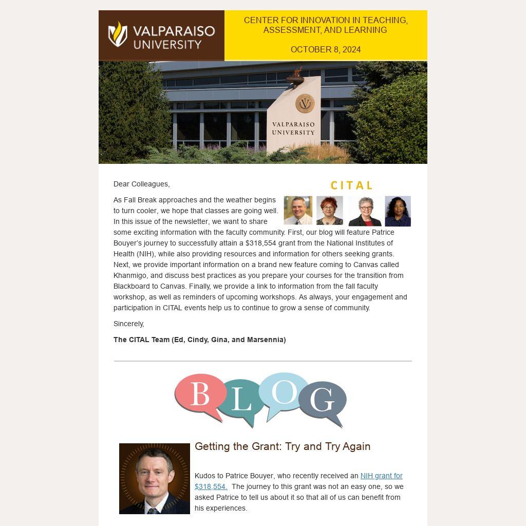 As Fall Break approaches and the weather begins to turn cooler, we hope that classes are going well. In this issue of the newsletter, we want to share some exciting information with the faculty community. First, our blog will feature Patrice Bouyer’s journey to successfully attain a $318,554 grant from the National Institutes of Health (NIH), while also providing resources and information for others seeking grants. Next, we provide important information on a brand new feature coming to Canvas called Khanmigo, and discuss best practices as you prepare your courses for the transition from Blackboard to Canvas. Finally, we provide a link to information from the fall faculty workshop, as well as reminders of upcoming workshops. As always, your engagement and participation in CITAL events help us to continue to grow a sense of community.