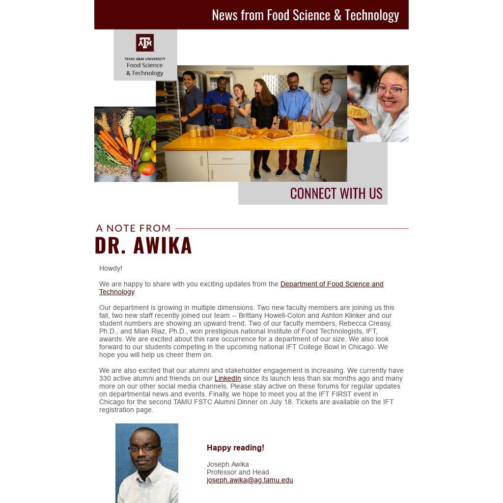 We are also excited that our alumni and stakeholder engagement is increasing. We currently have 330 active alumni and friends on our LinkedIn since its launch less than six months ago and many more on our other social media channels. Please stay active on these forums for regular updates on departmental news and events. Finally, we hope to meet you at the IFT FIRST event in Chicago for the second TAMU FSTC Alumni Dinner on July 18. Tickets are available on the IFT registration page.