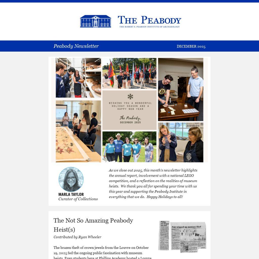 As we close out 2025, this month’s newsletter highlights the annual report, involvement with a national LEGO competition, and a reflection on the realities of museum heists. We thank you all for spending your time with us this year and supporting the Peabody Institute in everything that we do. Happy Holidays to all!