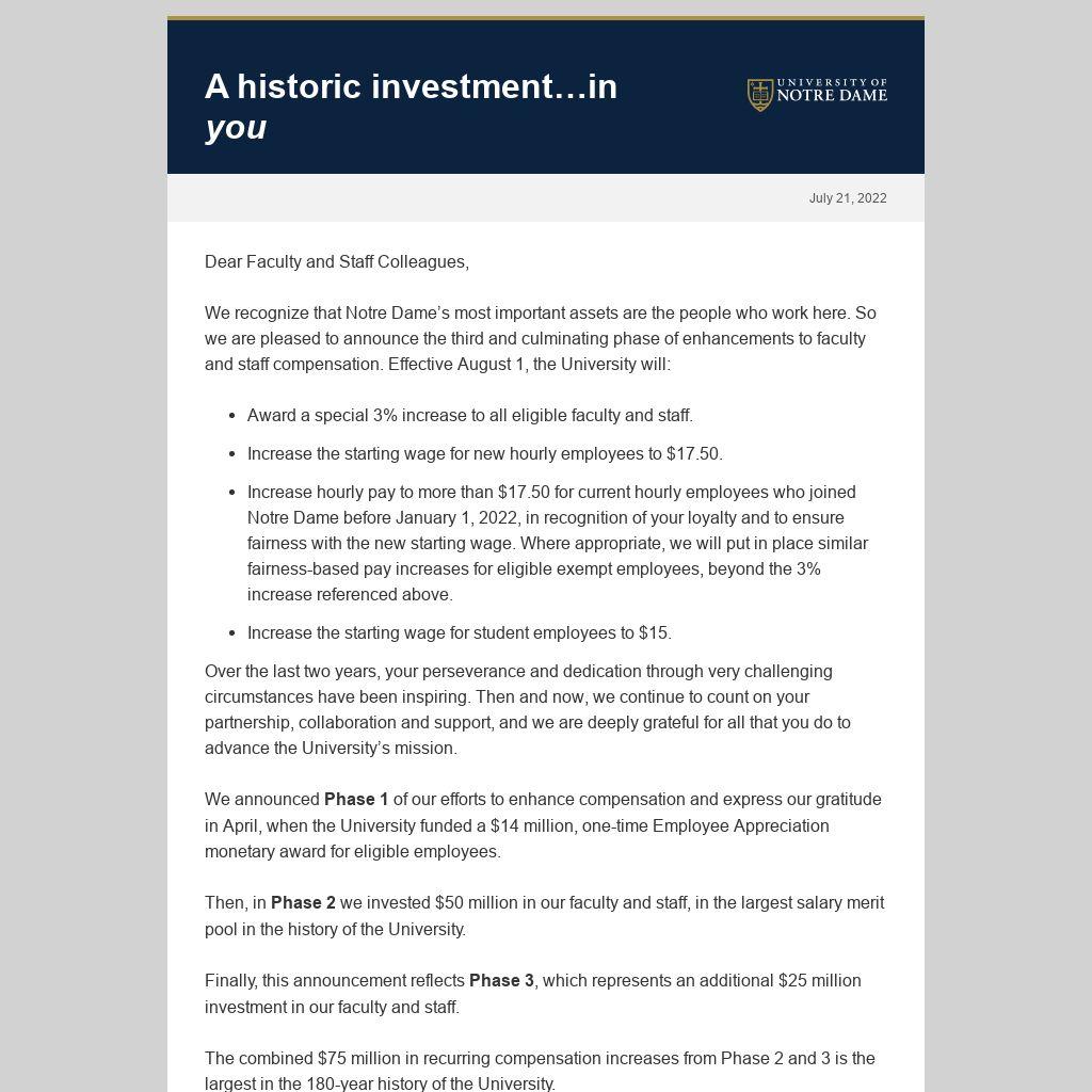 We recognize that Notre Dame’s most important assets are the people who work here. So we are pleased to announce the third and culminating phase of enhancements to faculty and staff compensation. Effective August 1, the University will: