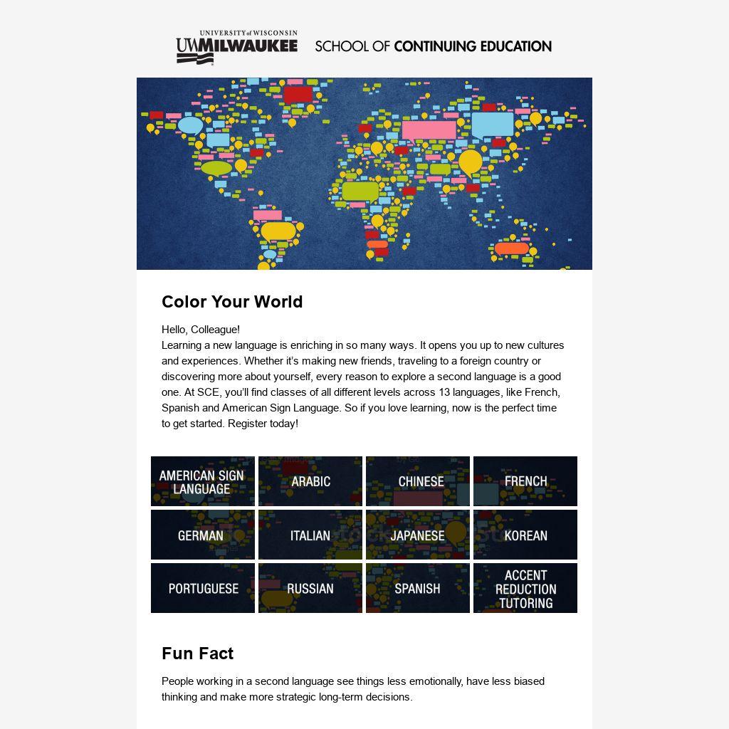 Learning a new language is enriching in so many ways. It opens you up to new cultures and experiences. Whether it’s making new friends, traveling to a foreign country or discovering more about yourself, every reason to explore a second language is a good one. At SCE, you’ll find classes of all different levels across 13 languages, like French, Spanish and American Sign Language. So if you love learning, now is the perfect time to get started. Register today!