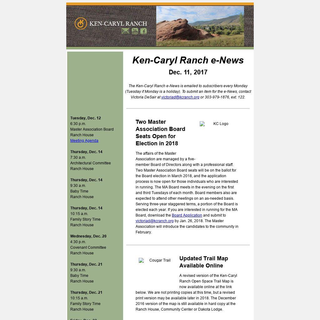 | The Ken-Caryl Ranch e-News is emailed to subscribers every Monday (Tuesday if Monday is a holiday). To submit an item for the e-News, contact Victoria DeSair at victoriad@kcranch.org or 303-979-1876, ext. 122.