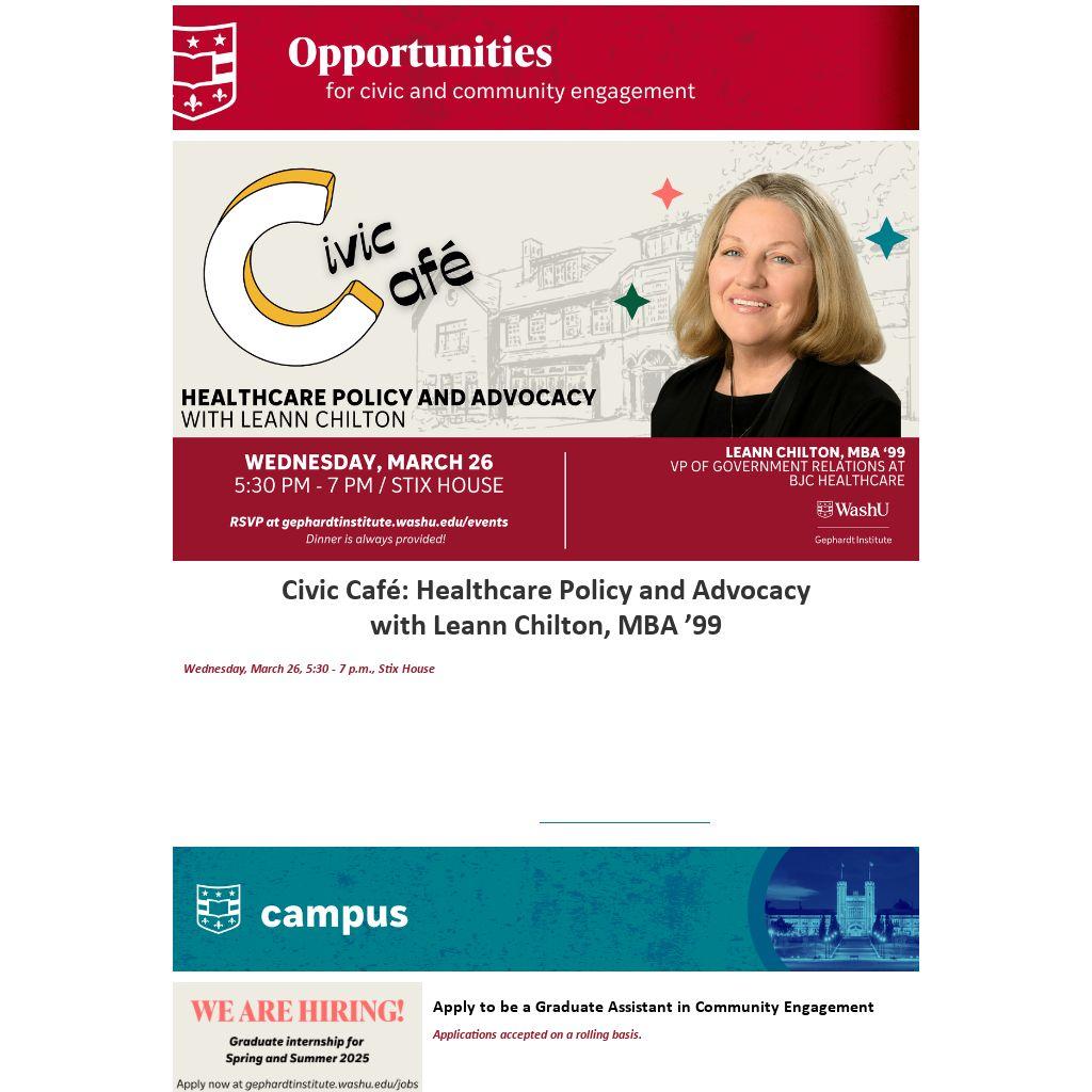 The Gephardt Institute is hiring a Graduate Assistant in Community Engagement! This role will assist with the operations and logistics of various community-facing programming opportunities for WashU students, with a primary focus on the St. Louis Fellows Program. The assistant will work with Gephardt staff to plan logistics for several key events, such as St. Louis-based immersion experiences, retreats, community events, and student presentations. This role is paid with a minimum of 10 to 15 hours per week during Spring and Summer 2025, and the option to renew for the 2025-2026 academic year. The ideal candidate will be able to commit to the role through May 2026. Learn more and apply.