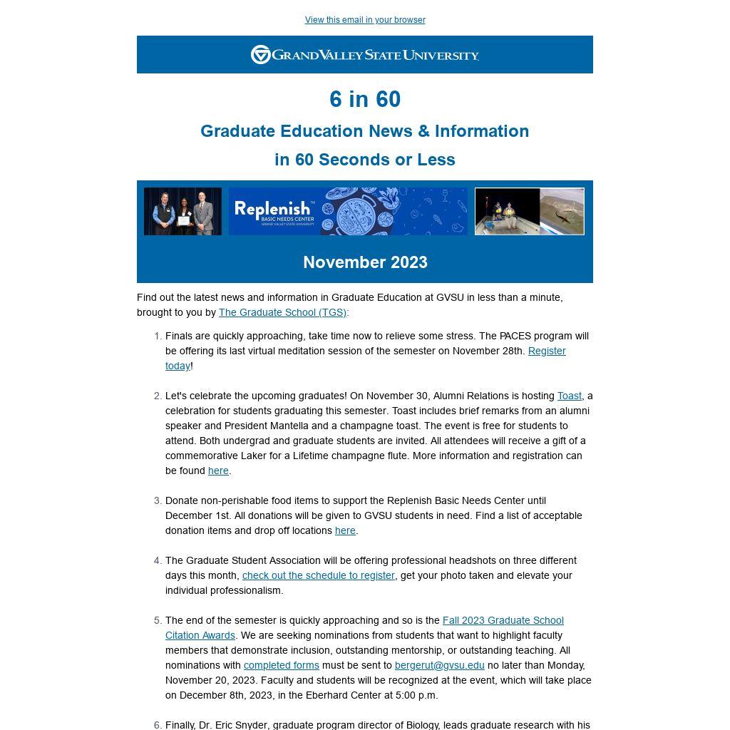 Find out the latest news and information in Graduate Education at GVSU in less than a minute, brought to you byThe Graduate School (TGS):