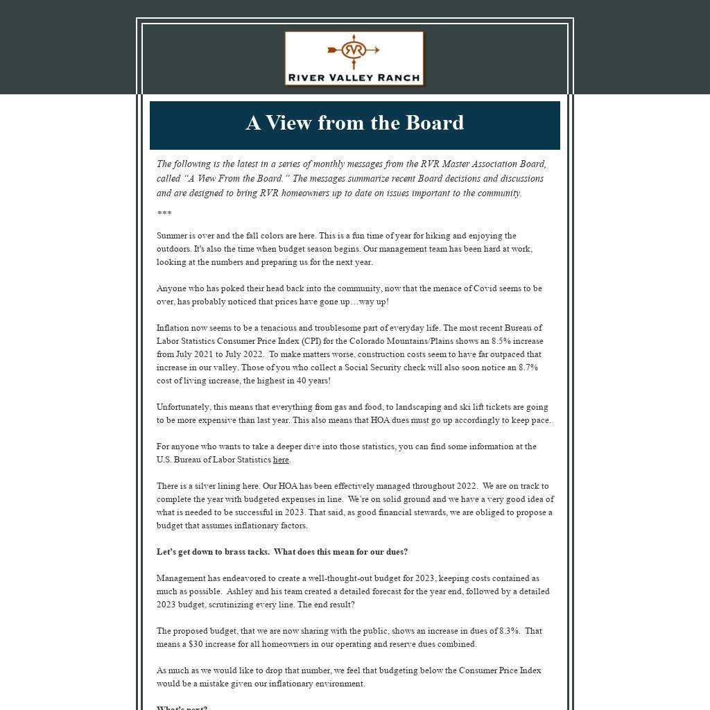 The following is the latest in a series of monthly messages from the RVR Master Association Board, called “A View From the Board.” The messages summarize recent Board decisions and discussions and are designed to bring RVR homeowners up to date on issues important to the community.