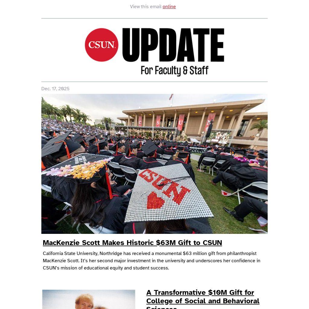 The campus will be closed for Winter Recess from December 24, 2025 through January 1, 2026. CSUN Update will be on hiatus for the next few weeks, but will return before the start of the spring 2026 semester. For the latest CSUN news, please visit the university homepage and CSUN Newsroom.