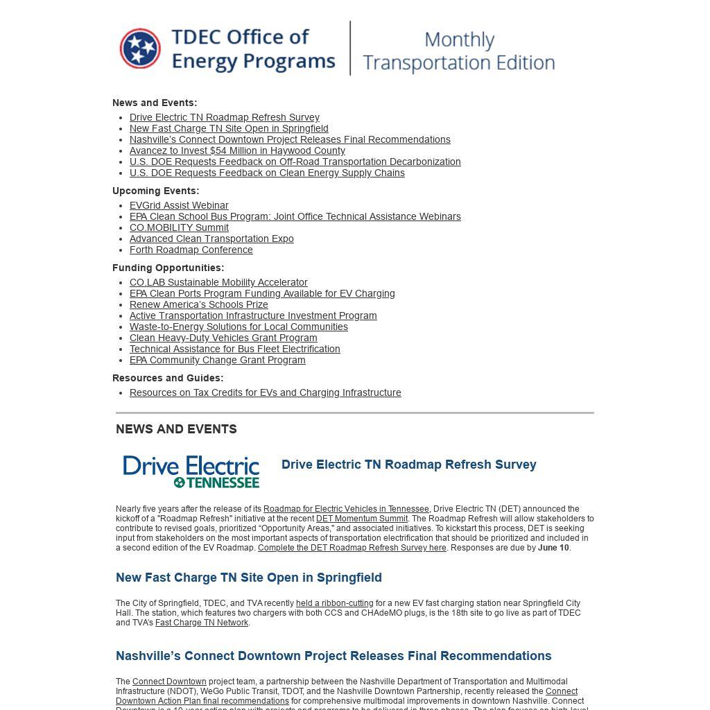 Nearly five years after the release of its Roadmap for Electric Vehicles in Tennessee, Drive Electric TN (DET) announced the kickoff of a "Roadmap Refresh" initiative at the recent DET Momentum Summit. The Roadmap Refresh will allow stakeholders to contribute to revised goals, prioritized “Opportunity Areas," and associated initiatives. To kickstart this process, DET is seeking input from stakeholders on the most important aspects of transportation electrification that should be prioritized and included in a second edition of the EV Roadmap. Complete the DET Roadmap Refresh Survey here. Responses are due by June 10.