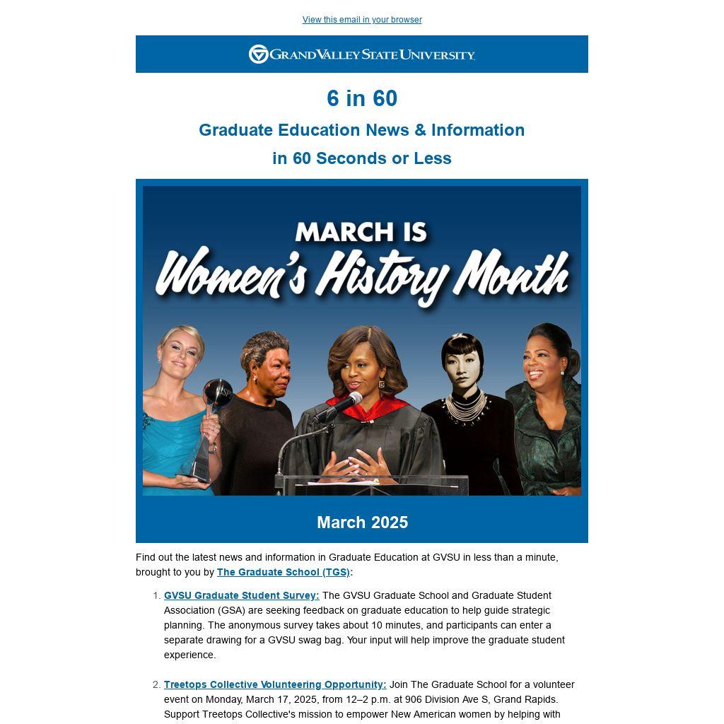 1. GVSU Graduate Student Survey: The GVSU Graduate School and Graduate Student Association (GSA) are seeking feedback on graduate education to help guide strategic planning. The anonymous survey takes about 10 minutes, and participants can enter a separate drawing for a GVSU swag bag. Your input will help improve the graduate student experience.