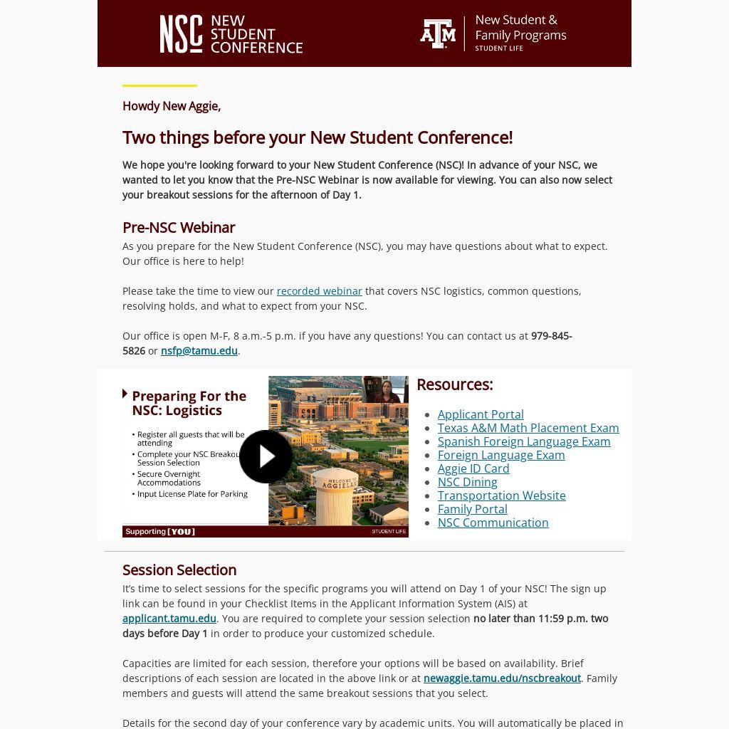 It’s time to select sessions for the specific programs you will attend on Day 1 of your NSC! The sign up link can be found in your Checklist Items in the Applicant Information System (AIS) at applicant.tamu.edu. You are required to complete your session selection no later than 11:59 p.m. two days before Day 1 in order to produce your customized schedule.