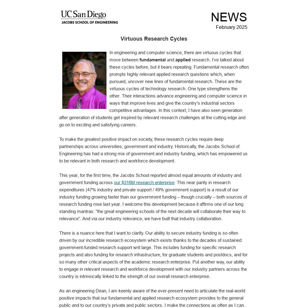 To make the greatest positive impact on society, these research cycles require deep partnerships across universities, government and industry. Historically, the Jacobs School of Engineering has had a strong mix of government and industry funding, which has empowered us to be relevant in both research and workforce development.