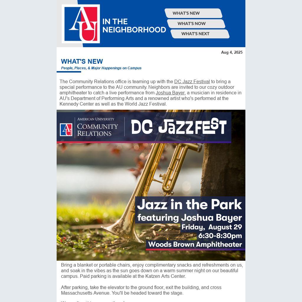 The Community Relations office is teaming up with the DC Jazz Festival to bring a special performance to the AU community. Neighbors are invited to our cozy outdoor amphitheater to catch a live performance from Joshua Bayer, a musician in residence in AU's Department of Performing Arts and a renowned artist who's performed at the Kennedy Center as well as the World Jazz Festival.