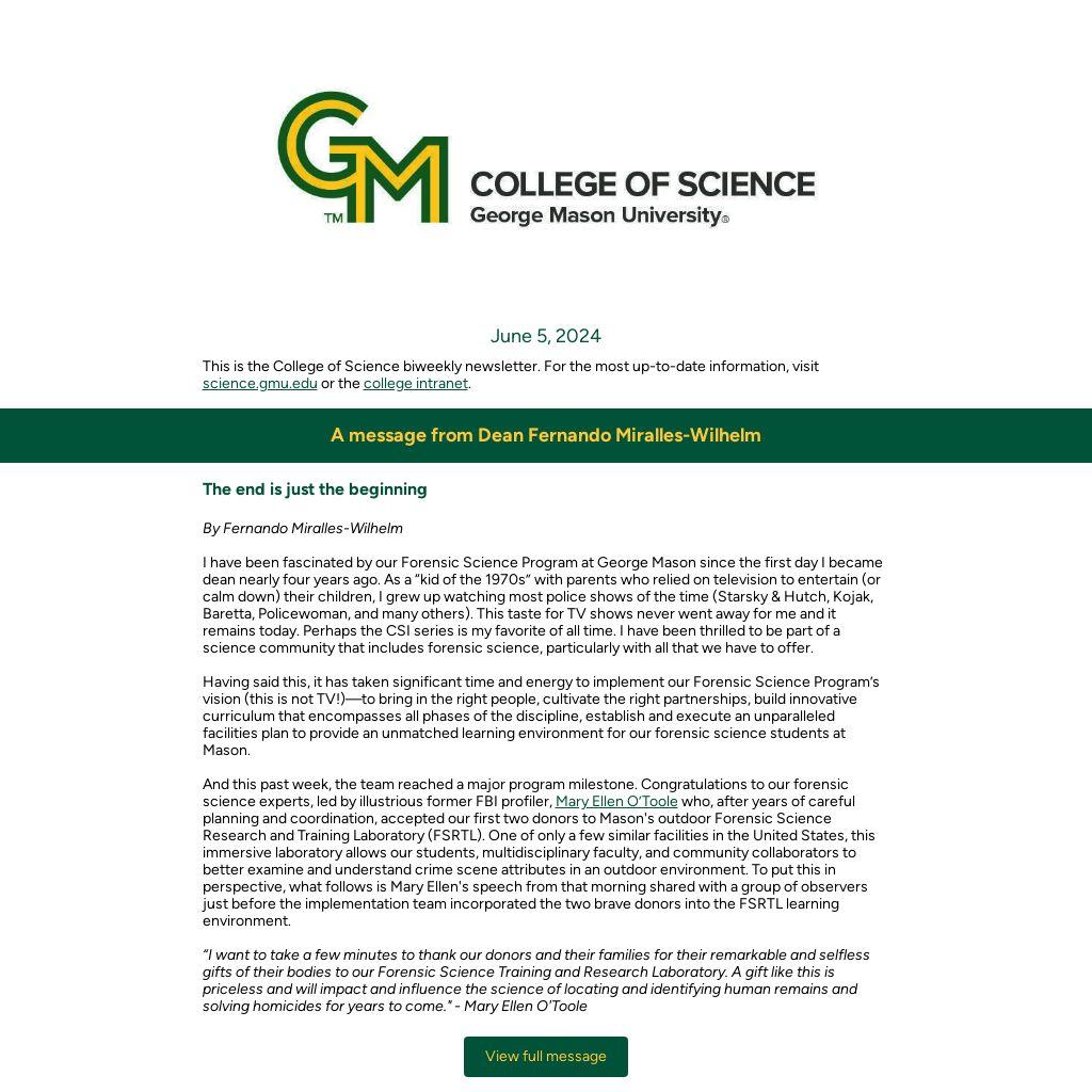 I have been fascinated by our Forensic Science Program at George Mason since the first day I became dean nearly four years ago. As a “kid of the 1970s” with parents who relied on television to entertain (or calm down) their children, I grew up watching most police shows of the time (Starsky & Hutch, Kojak, Baretta, Policewoman, and many others). This taste for TV shows never went away for me and it remains today. Perhaps the CSI series is my favorite of all time. I have been thrilled to be part of a science community that includes forensic science, particularly with all that we have to offer.