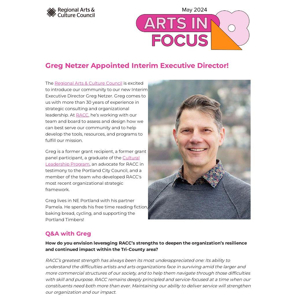 The Regional Arts & Culture Council is excited to introduce our community to our new Interim Executive Director Greg Netzer. Greg comes to us with more than 30 years of experience in strategic consulting and organizational leadership. At RACC, he’s working with our team and board to assess and design how we can best serve our community and to help develop the tools, resources, and programs to fulfill our mission.
