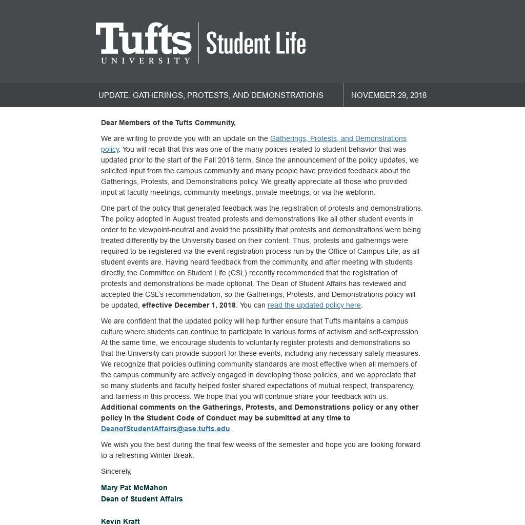 We are writing to provide you with an update on the Gatherings, Protests, and Demonstrations policy. You will recall that this was one of the many polices related to student behavior that was updated prior to the start of the Fall 2018 term. Since the announcement of the policy updates, we solicited input from the campus community and many people have provided feedback about the Gatherings, Protests, and Demonstrations policy. We greatly appreciate all those who provided input at faculty meetings, community meetings, private meetings, or via the webform. One part of the policy that generated feedback was the registration of protests and demonstrations. The policy adopted in August treated protests and demonstrations like all other student events in order to be viewpoint-neutral and avoid the possibility that protests and demonstrations were being treated differently by the University based on their content. Thus, protests and gatherings were required to be registered via the event registration process run by the Office of Campus Life, as all student events are. Having heard feedback from the community, and after meeting with students directly, the Committee on Student Life (CSL) recently recommended that the registration of protests and demonstrations be made optional. The Dean of Student Affairs has reviewed and accepted the CSL’s recommendation, so the Gatherings, Protests, and Demonstrations policy will be updated, effective December 1, 2018. You can read the updated policy here. We are confident that the updated policy will help further ensure that Tufts maintains a campus culture where students can continue to participate in various forms of activism and self-expression. At the same time, we encourage students to voluntarily register protests and demonstrations so that the University can provide support for these events, including any necessary safety measures. We recognize that policies outlining community standards are most effective when all members of the campus community are actively engaged in developing those policies, and we appreciate that so many students and faculty helped foster shared expectations of mutual respect, transparency, and fairness in this process. We hope that you will continue share your feedback with us. Additional comments on the Gatherings, Protests, and Demonstrations policy or any other policy in the Student Code of Conduct may be submitted at any time to DeanofStudentAffairs@ase.tufts.edu. We wish you the best during the final few weeks of the semester and hope you are looking forward to a refreshing Winter Break.