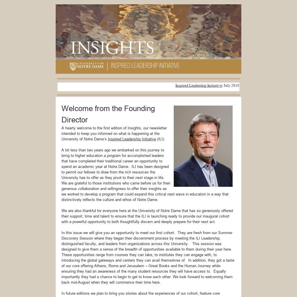 Welcome from the Founding DirectorA hearty welcome to the first edition of Insights, our newsletter intended to keep you informed on what is happening at the University of Notre Dame’s Inspired Leadership Initiative (ILI).