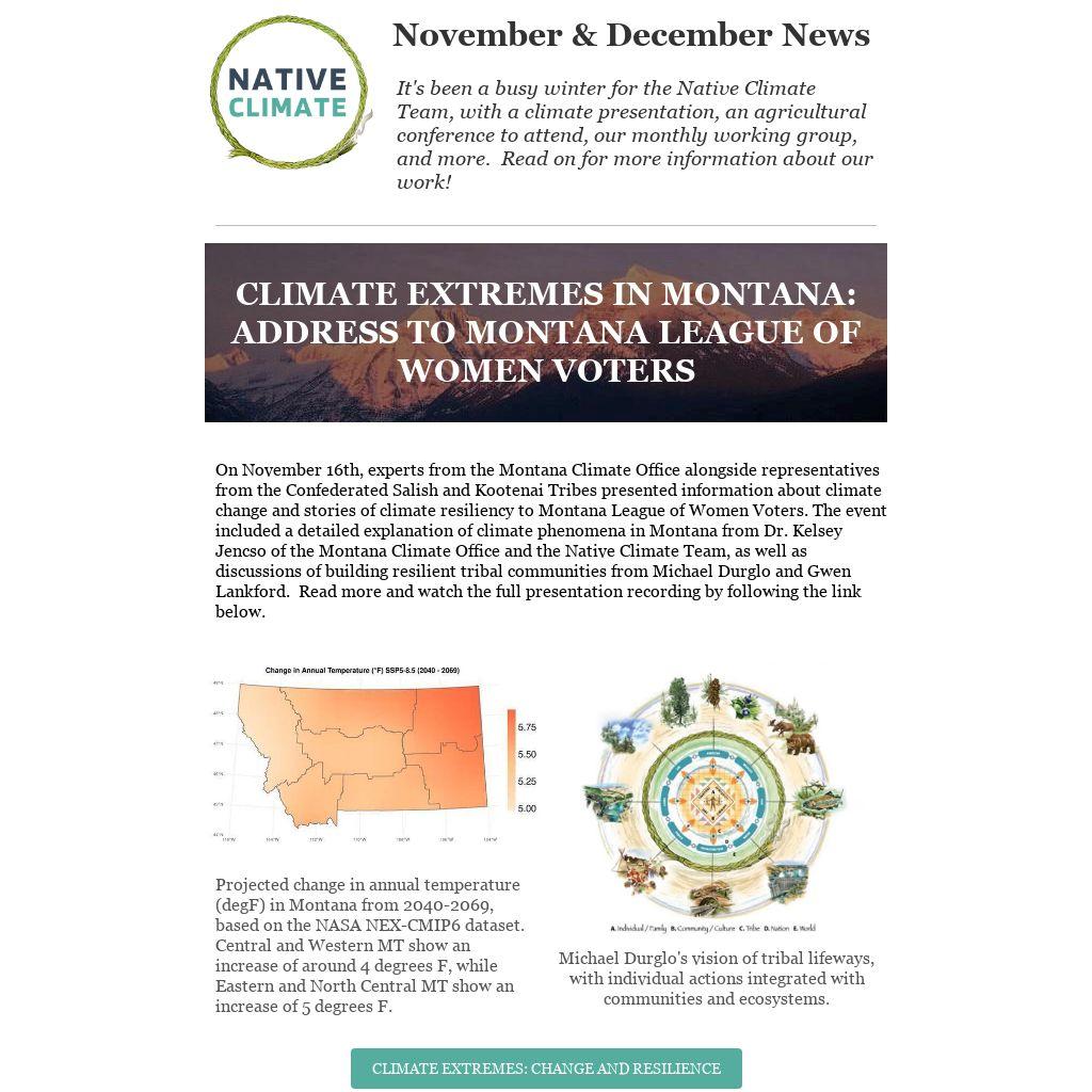 On November 16th, experts from the Montana Climate Office alongside representatives from the Confederated Salish and Kootenai Tribes presented information about climate change and stories of climate resiliency to Montana League of Women Voters. The event included a detailed explanation of climate phenomena in Montana from Dr. Kelsey Jencso of the Montana Climate Office and the Native Climate Team, as well as discussions of building resilient tribal communities from Michael Durglo and Gwen Lankford. Read more and watch the full presentation recording by following the link below.