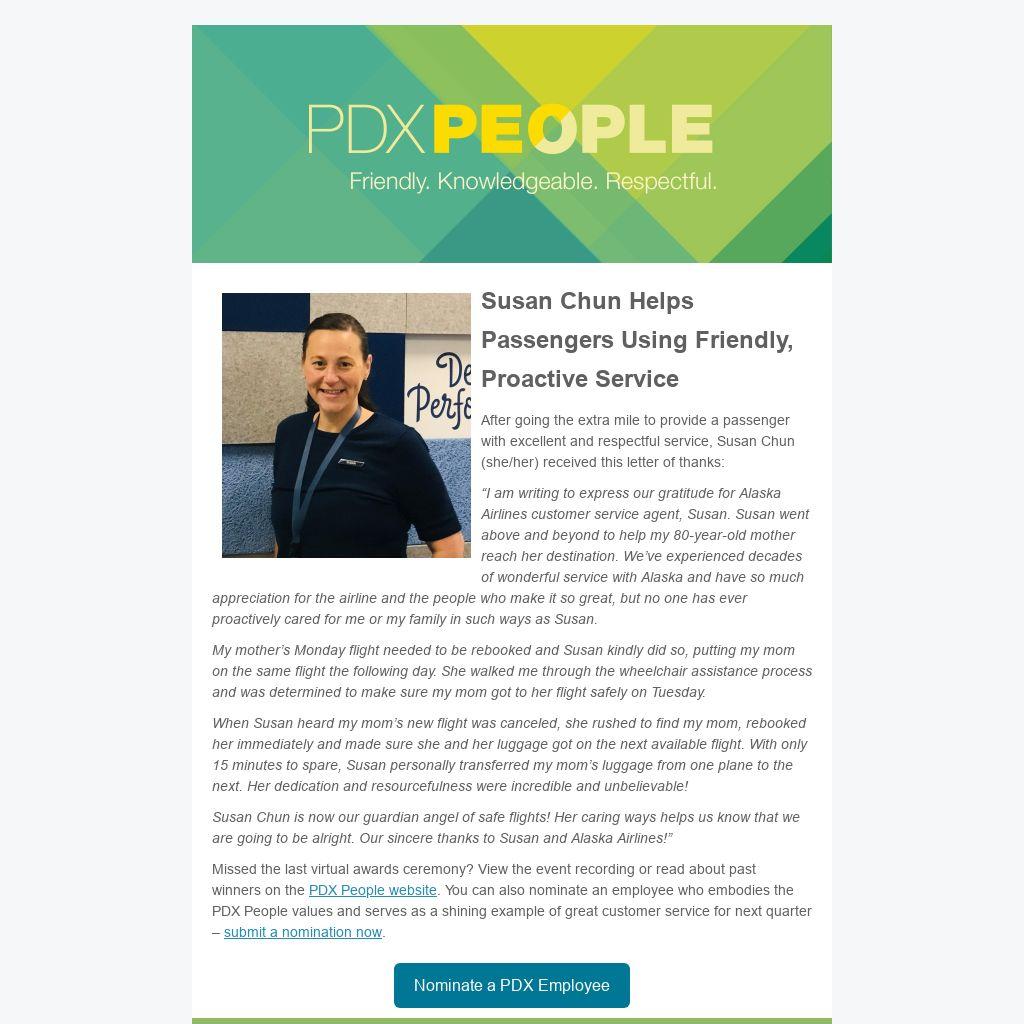Missed the last virtual awards ceremony? View the event recording or read about past winners on the PDX People website. You can also nominate an employee who embodies the PDX People values and serves as a shining example of great customer service for next quarter – submit a nomination now.