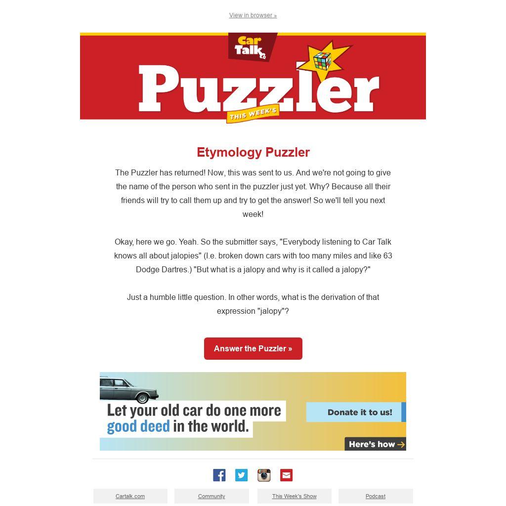 Okay, here we go. Yeah. So the submitter says, "Everybody listening to Car Talk knows all about jalopies" (I.e. broken down cars with too many miles and like 63 Dodge Dartres.) "But what is a jalopy and why is it called a jalopy?"