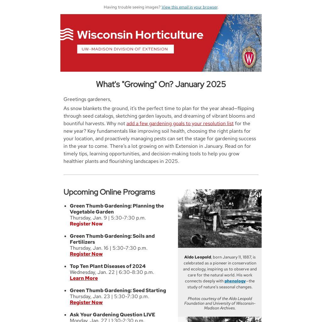 As snow blankets the ground, it’s the perfect time to plan for the year ahead—flipping through seed catalogs, sketching garden layouts, and dreaming of vibrant blooms and bountiful harvests. Why not add a few gardening goals to your resolution list for the new year? Key fundamentals like improving soil health, choosing the right plants for your location, and proactively managing pests can set the stage for gardening success in the year to come. There’s a lot growing on with Extension in January. Read on for timely tips, learning opportunities, and decision-making tools to help you grow healthier plants and flourishing landscapes in 2025.Â