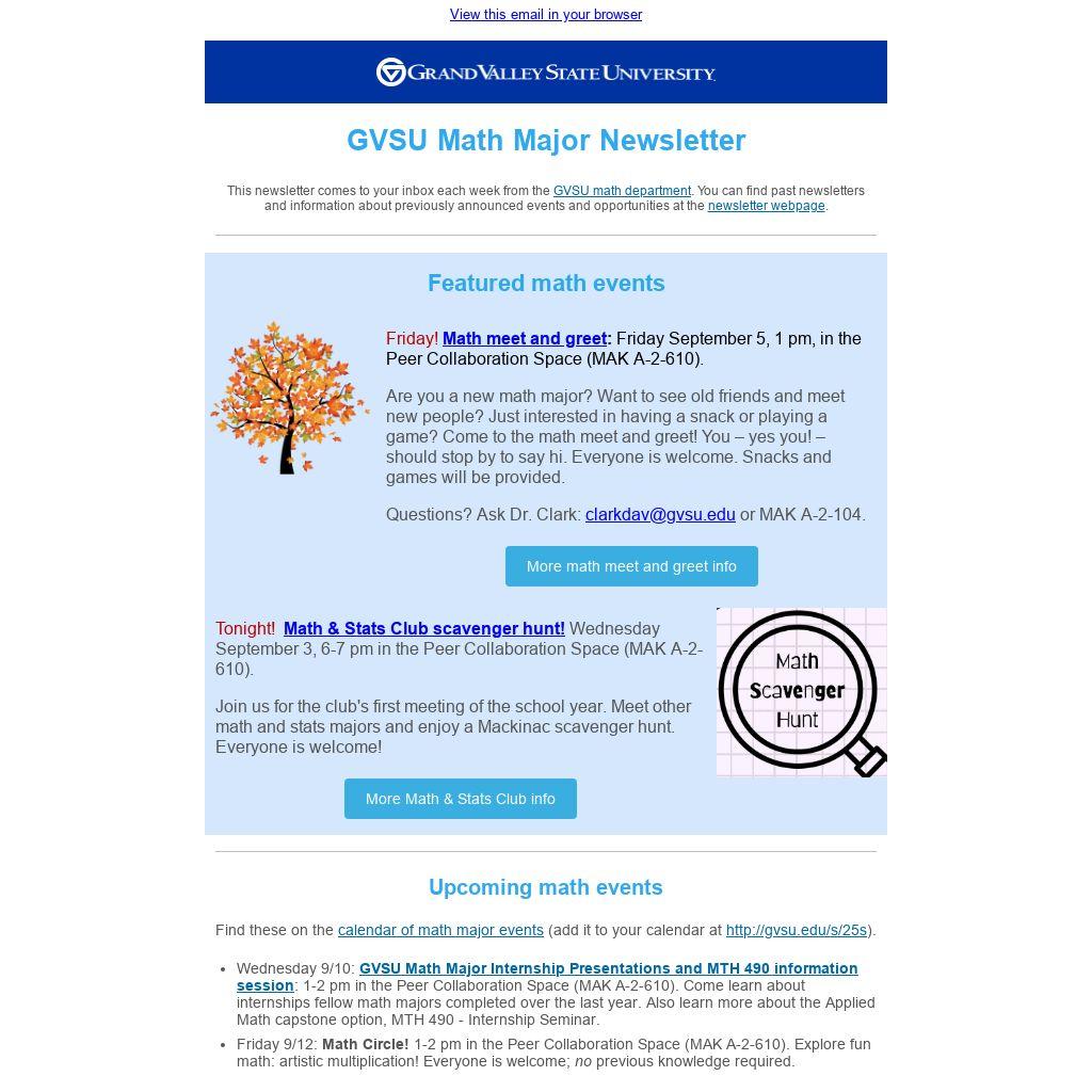 This newsletter comes to your inbox each week from the GVSU math department. You can find past newsletters and information about previously announced events and opportunities at the newsletter webpage.