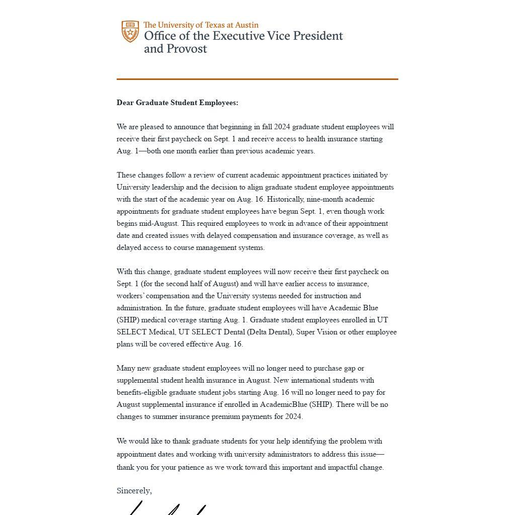 With this change, graduate student employees will now receive their first paycheck on Sept. 1 (for the second half of August) and will have earlier access to insurance, workers’ compensation and the University systems needed for instruction and administration. In the future, graduate student employees will have Academic Blue (SHIP) medical coverage starting Aug. 1. Graduate student employees enrolled in UT SELECT Medical, UT SELECT Dental (Delta Dental), Super Vision or other employee plans will be covered effective Aug. 16.