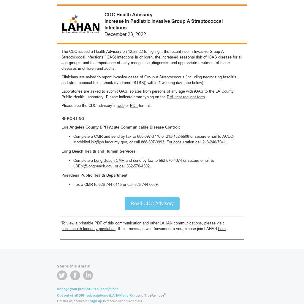 The CDC issued a Health Advisory on 12.22.22 to highlight the recent rise in Invasive Group A Streptococcal Infections (iGAS) infections in children, the increased seasonal risk of iGAS disease for all age groups, and the importance of early recognition, diagnosis, and appropriate treatment of these diseases in children and adults.