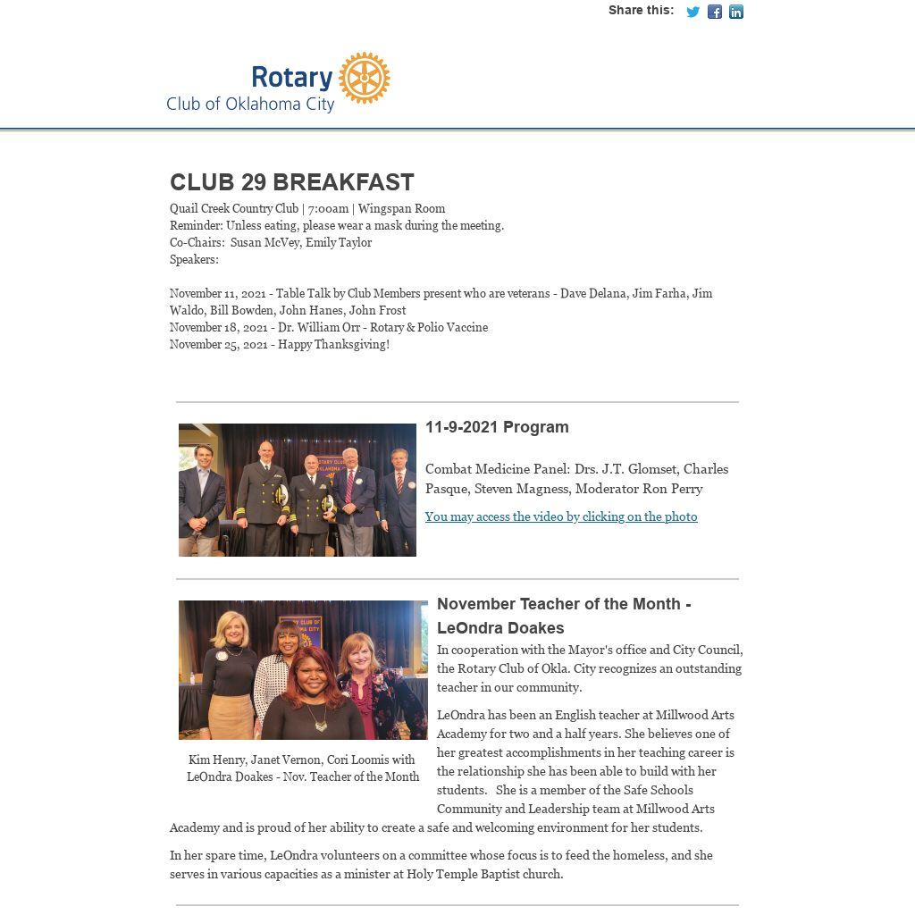 Rotary Club 29 has an online membership directory which contains current content information for all club members. The link to access the Club 29 directory can be found at the top of the home page of okcrotary.club or by clicking here.