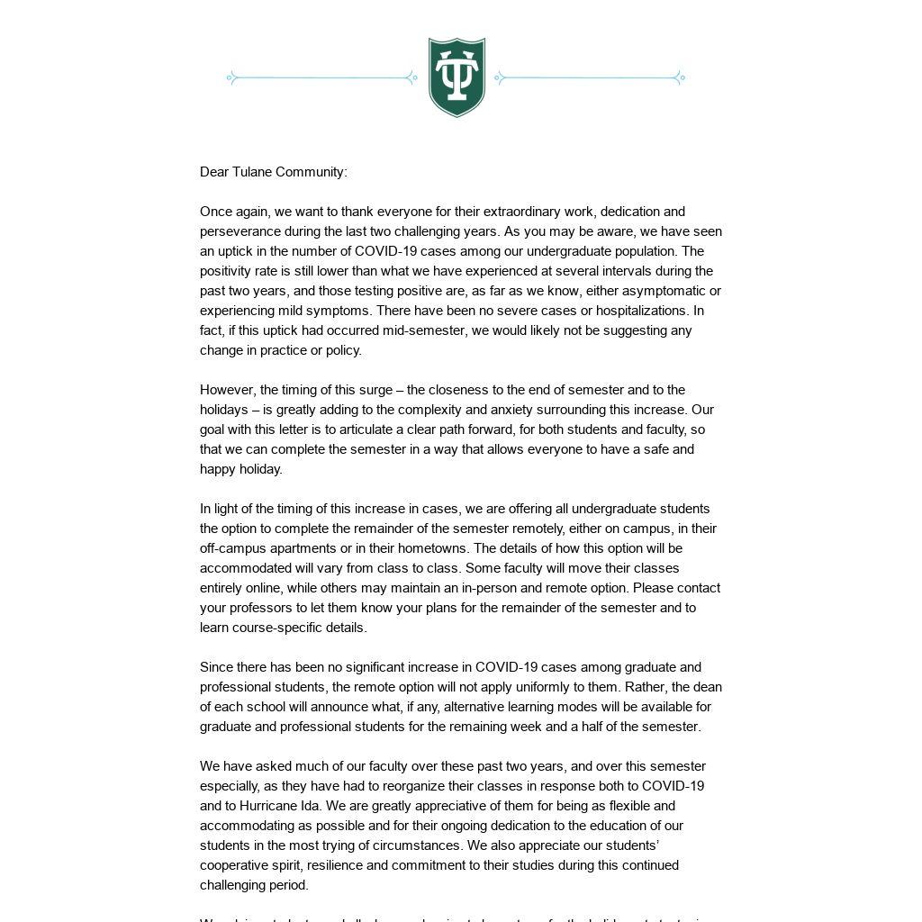 Dear Tulane Community: