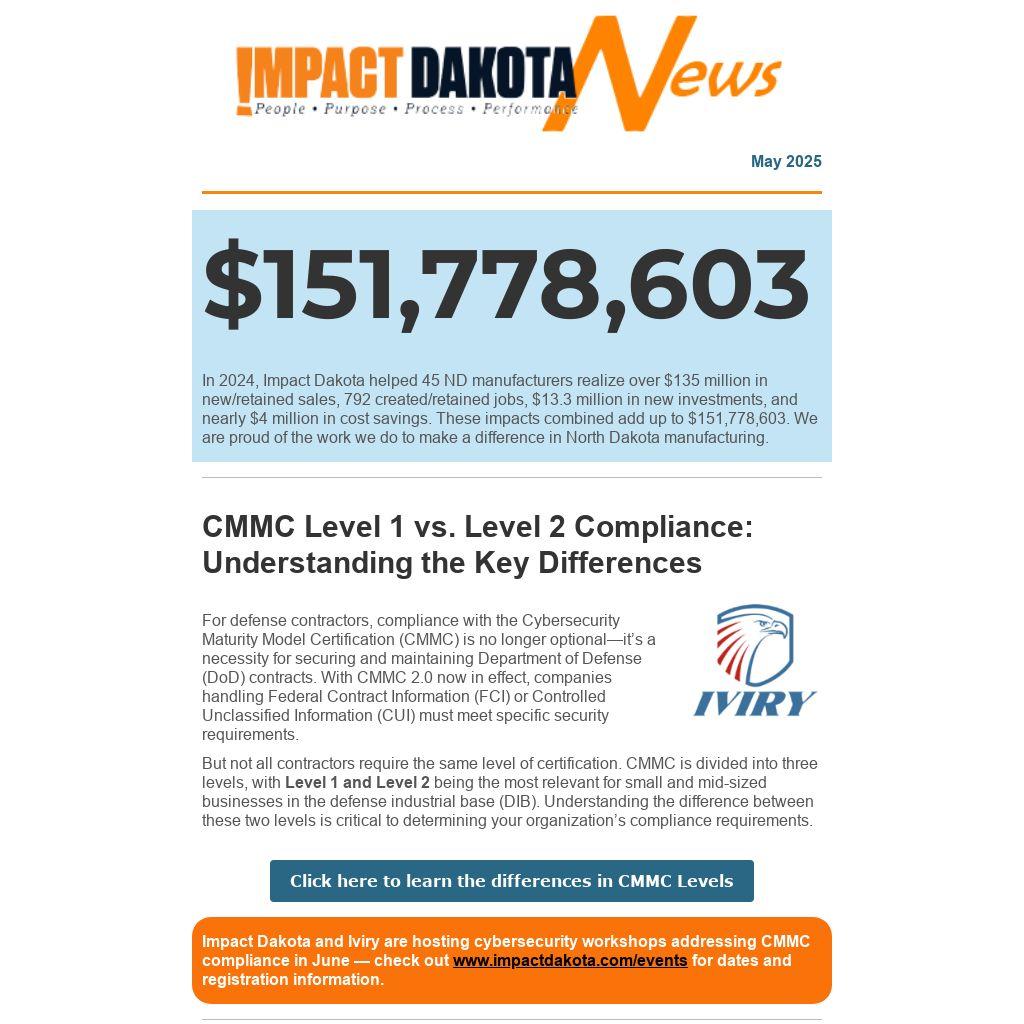 Impact Dakota and Iviry are hosting cybersecurity workshops addressing CMMC compliance in June — check out www.impactdakota.com/events for dates and registration information.