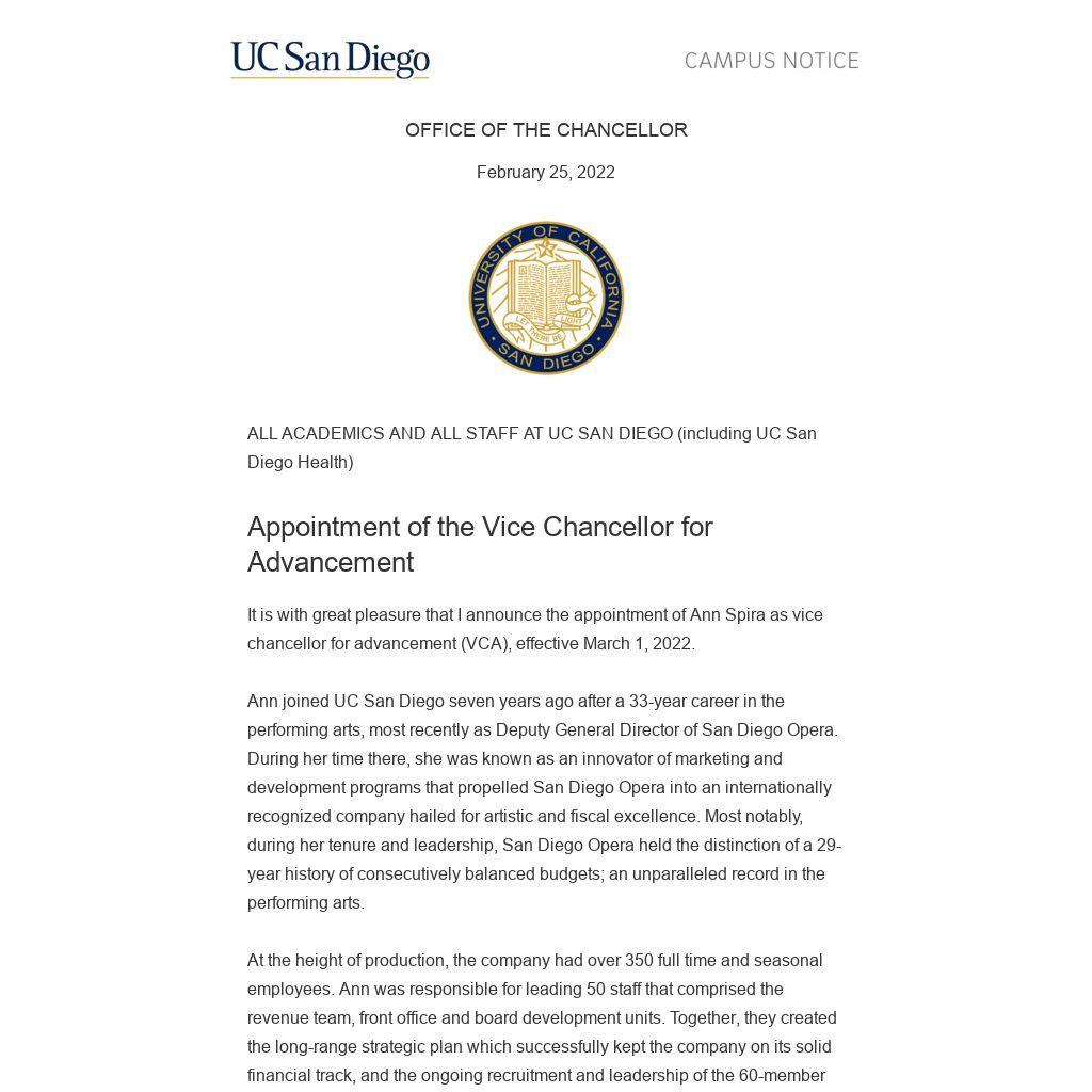 Please join me in warmly welcoming Ann Spira to her new role as UC San Diego’s vice chancellor for advancement. Her collaborative approach, deep expertise and visionary leadership will continue to expand opportunities that promote and diversify the global prestige and distinction of our university’s scholarship, groundbreaking discovery and service to the region and beyond.